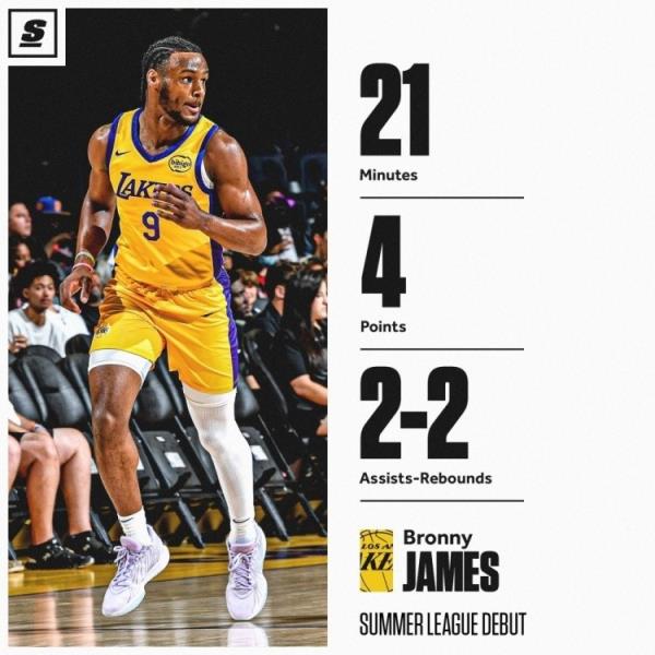 布朗尼-詹姆斯首秀出战21分钟,9投2中,三分3中0,罚球2中0,得到4分2篮板2助攻1抢断,正负值-15。