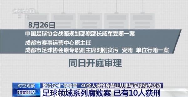 8月26日,中国足球协会战略规划部原部长戚军受贿一案。成都市赛事运营中心原主任、成都市足球协会原专职副主席刘刚贪污、受贿、单位行贿一案,同日开庭审理。