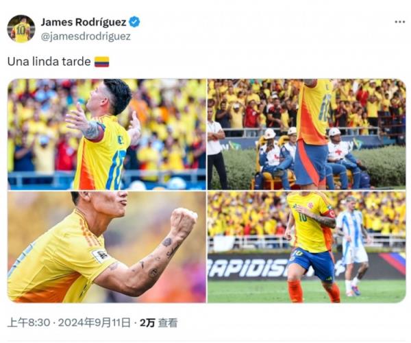 9月11日讯 在北京时间今天早上结束的南美世预赛中,J罗传射建功,帮助哥伦比亚主场2-1击败阿根廷。