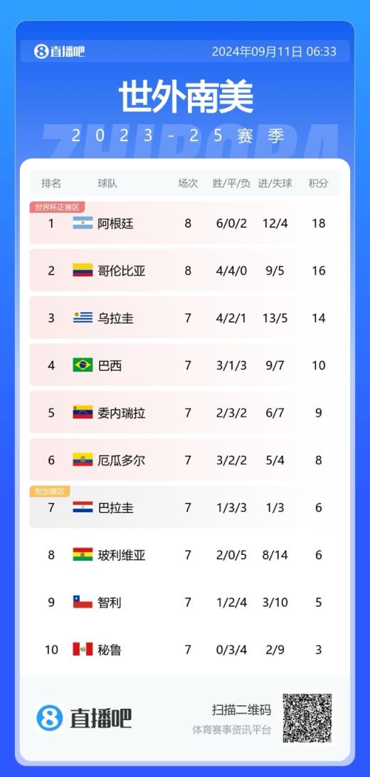 南美世预赛积分榜: